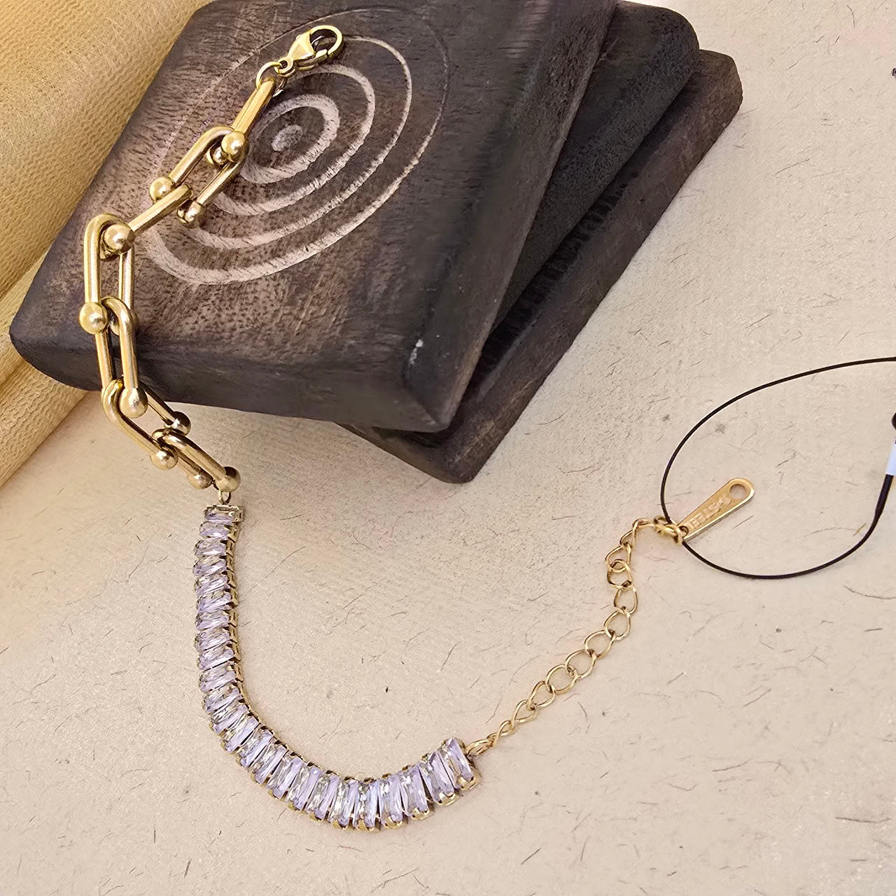 The sparkling crystal section adds luxury and shine, while the chunky gold chain detail gives it a trendy, fashion-forward look. Designed with an adjustable extension chain, it offers both comfort and a perfect fit.